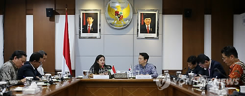| △ 남경필 지사와 인도네시아 인력개발사회복지 장관 (자카르타=연합뉴스) 아세안(ASEAN)시장개척과 청년일자리 창출 방안 마련을 위해 인도네시아를 방문 중인 남경필 경기도지사가 12일 인도네시아 자카르타시 인력개발사회복지분야 조정부 장관실에서 푸안 마하라니 조정장관을 만나 보건의료협력과 여성능력개발센터 건립, 관광분야 협력 등에 대해 논의하고 있다. 푸안 마하라니 장관은 인도네시아 건국의 아버지라 불리는 수카르노 초대 대통령의 손녀이자, 메가와티 전 인도네시아 대통령의 딸이다. 2015.5.12 <<경기도청>> you@yna.co.kr |