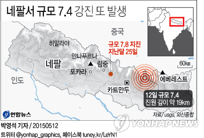 (뉴델리=연합뉴스) 나확진 특파원 = 네팔에서 규모 7.4의 강진이 12일 오후 12시35분(현지시간) 다시 발생했다.