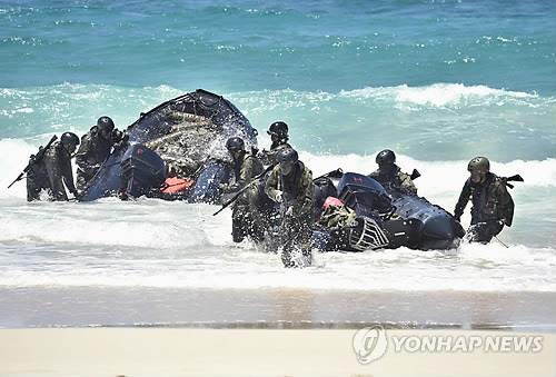 | △ 2014년 7월 1일(현지시간) 미국 하와이의 카네오헤 해병대 기지 해안에서 상륙작전을 펼치고 있는 일본 육상자위대원.(교도=연합뉴스DB) |