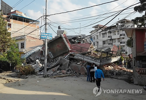 | △ 네팔 추가 지진으로 무너진 병원 (뉴델리=연합뉴스) 나확진 특파원 = 12일 발생한 규모 7.3의 추가 지진으로 네팔 수도 카트만두 남부 파탄 지역에 있는 옴카르 병원이 무너졌다. (네팔 교민 문광진씨 제공) |