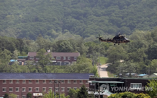 | △ 분주한 예비군훈련장 (서울=연합뉴스) 신준희 기자 = 13일 총기 사고가 발생한 서울 내곡동 예비군훈련장에 헬기가 내리고 있다. 오른쪽 오르막길이 사고 장소인 사격장으로 향하는 길. 2015.5.13 hama@yna.co.kr |