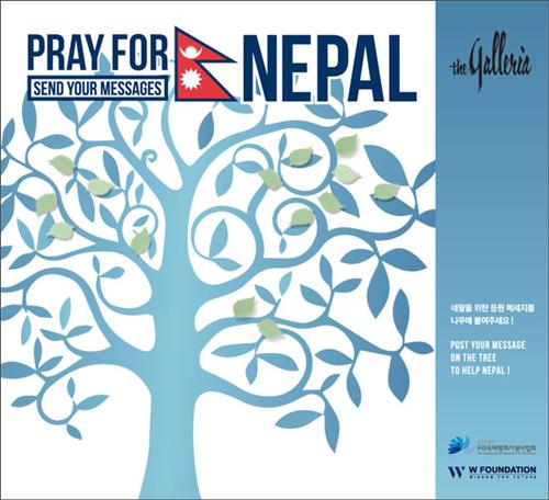 이번 'PRAY FOR NEPAL'(네팔을 위해 기도해주세요) 캠페인은 산업통산자원부 산하 비영리 국제구호기관 '소통을 위한 젊은 재단'(W-재단)과 함께 하는 것으로, 갤러리아명품관을 포함한 모든 지점에서 진행된다.