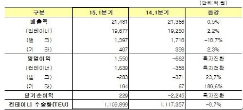 벌크 부문(포장되지 않은 화물)은 시황 부진으로 283억원의 영업손실을 기록했으나 손실폭은 전년 동기 대비 23.7% 감소했다.