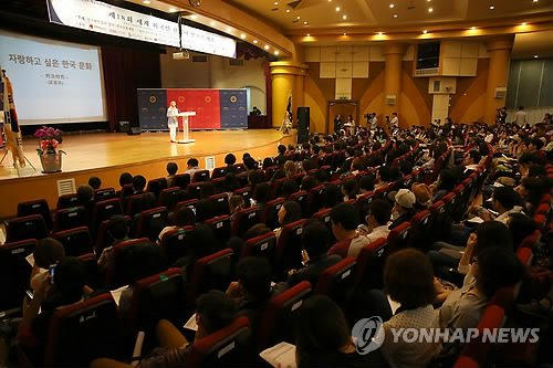 | △ 제18회 세계 외국인 한국어 말하기 대회 (서울=연합뉴스) 황광모 기자 = 14일 오후 서울 경희대학교에서 열린 제18회 세계 외국인 한국어 말하기 대회에서 참가자가 한국문화 체험에 대한 자신의 경험을 발표하고 있다. 세종대왕 탄신 618주년 기념으로 열린 이번 행사는 경희대학교 국제교육원과 연합뉴스가 공동 주최했다. |