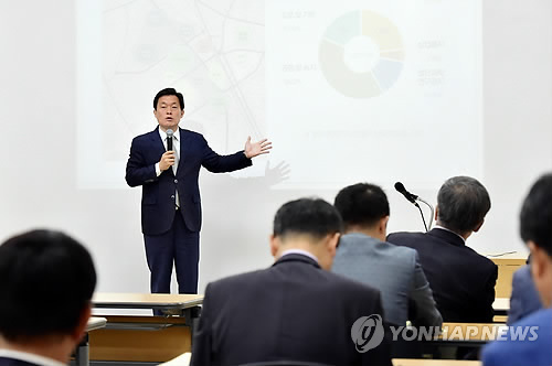| △ 군공항 이전 타당성 설명하는 이재준 수원시 제2부시장 (수원=연합뉴스) 14일 경기도 양평군 코바코 연수원에서 열린 수원 군 공항이전건의서 평가위원회에서 이재준 수원시 제2부시장이 이전 타당성을 설명하고 있다. 2015.5.14 <<수원시 제공>> kcg33169@yna.co.kr |