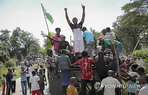 | △ 브룬디 시민 봉기 '군부도 동조했어요' (부줌부라 AP=연합뉴스) 피에르 은쿠룬지자 대통령의 3선 출마에 반대하며 3주째 시민 봉기가 이어진 브룬디에서 13일(현지시간) 시민들이 군 트럭 뒤에 올라타고 가며 승리의 신호를 보내고 있다. 이날 수도 부줌부라에는 시위 진압에 나섰던 경찰의 모습이 보이지 않았고, 군인들이 장갑차 위에서 한가롭게 앉아 웃으며 손을 흔드는 모습이 포착됐다. kjw@yna.co.kr |