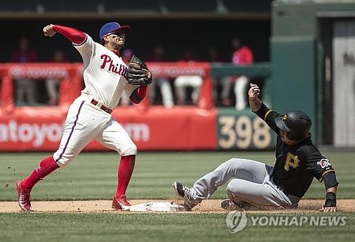| △ 강정호(28.피츠버그 파이리츠)가 14일(현지시간) 필라델피아 필리스와의 미국프로야구 경기에서 5회 몸에 맞은 공으로 출루한 뒤 후속 타자의 땅볼 때 2루에 슬라이딩했으나 아웃됐다. (AP=연합뉴스) |