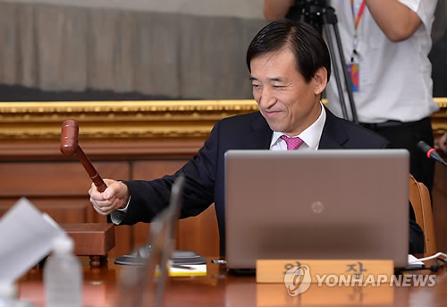 | △ '기준금리 향방은?' (서울=연합뉴스) 김주성 기자 = 이주열 한국은행 총재가 15일 오전 서울 중구 한국은행에서 현재 연 1.75%인 기준금리 조정 안건을 심의하기 위한 금융통화위원회의를 시작하며 의사봉을 두드리고 있다. |