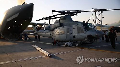 | △ 지난 3일(현지시간) 네팔 카트만두 트리부반 공항에서 네팔 지진 구호활동을 위해 파견된미 해병대 소속 UH-1Y 휴이 헬기가 보잉 C-17 수송기에서 내리고 있다. 네팔에 파견된 휴이 헬기 가운데 1대가 지난 12일 구호활동 중 실종됐다.(EPA=연합뉴스 자료사진) |