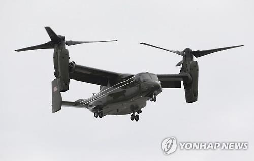 앞서 지난 17일 미국 하와이에서 훈련 중이던 미 해병대의 MV22 오스프리가 착륙 실패로 화염에 휩싸이면서 해병대원 1명이 사망하고 20여명이 병원으로 옮겨지는 사고가 발생했다.