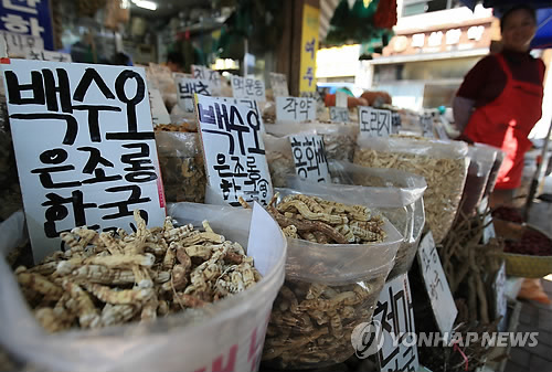 | △ '가짜 백수오' 논란 속 자취 감춘 이엽우피소 (서울=연합뉴스) 홍해인 기자 = '가짜 백수오(약재)' 이엽우피소 논란으로 코스닥 시장이 출렁이고 약재 시장에서도 이엽우피소가 자취를 감췄다. 식품의약품안전처는 30일 '가짜 백수오' 논란을 빚어온 내츄럴엔도텍의 백수오 제품을 재조사한 결과 이엽우피소 성분이 검출됐다고 밝혔다. 백수오는 안면홍조, 손발 저림, 신경과민 등 갱년기 여성의 증상을 완화해주는 효과가 있는 것으로 알려져 있다. 이엽우피소는 백수오와 겉모양이 비슷해 구분이 어렵고, 백수오보다 상대적으로 재배기간이 짧고 가격이 저렴해 종종 '사기 판매 논란'이 불거지기도 했다. 사진은 이날 오후 서울 동대문구 경동시장 약령시 한 매장에 진열된 백수오와 약재들. 약재상들은 최근 논란으로 약재시에서 이엽우피소를 찾기 힘들어졌다고 설명했다. 2015.4.30 hihong@yna.co.kr |