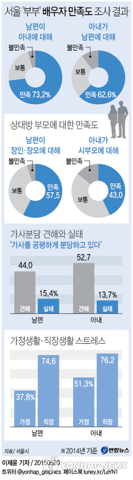 | △ <그래픽> 서울 '부부' 배우자 만족도 조사 결과 (서울=연합뉴스) 이재윤 기자 = 부부의 날(21일)을 앞두고 서울시가 20일 발표한 통계에 따르면 지난해 서울 부부 중 남편은 73.2%, 아내는 62.6%가 배우자에게 만족한다고 답했다. 또 남성의 절반가량이 가사노동을 공평하게 분담해야 한다고 생각은 하지만, 실제로 공평하게 분담하는 경우는 15%에 그치는 것으로 파악됐다. yoon2@yna.co.kr |