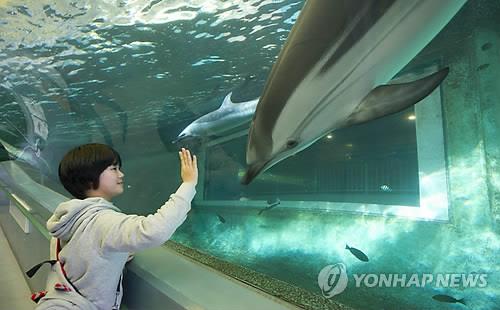 | △ (EPA=연합뉴스.자료사진) 한 소녀가 일본 와카야마현 다이지초의 수족관에서 헤엄치는 돌고래를 바라보고 있는 모습. |