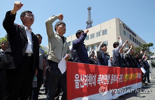 | △ 경찰서 앞에서 열린 기자회견 (울산=연합뉴스) 김용태 기자 = 21일 오전 울산 동부경찰서 정문 앞에서 민주노총 울산본부가 기자회견을 열고 구호를 외치고 있다. 이들은 20일 울산과학대 본관 점거 시위 과정에서 연행된 조합원 22명을 석방해달라고 촉구했다. 2015.5.21 yongtae@yna.co.kr |