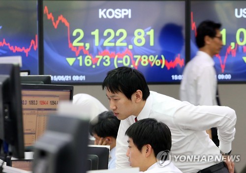 | △ 코스피 2,122.81에 장마감 (서울=연합뉴스) 서명곤 기자 = 코스피가 전 거래일보다 16.73p(0.78%) 내린 2,122.81에 거래를 마감한 21일 오후 서울 중구 명동 외환은행 본점 딜링룸에서 딜러들이 대화를 나누고 있다. |