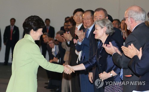 | △ 박근혜 대통령과 유네스코 사무총장 (인천=연합뉴스) 백승렬 기자 = 박근혜 대통령과 이리나 보코바 유네스코 사무총장 등 참석자들이 19일 인천시 송도 컨벤시아에서에서 열린 세계교육포럼 개회식에서 악수하고 있다. 2015.5.19 srbaek@yna.co.kr |