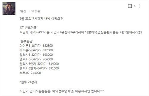| △ 한 판매점이 인터넷 사이트에서 공지한 불법 지원금. '원두 21봉지'는 불법 지원금 21만원을 의미한다. |