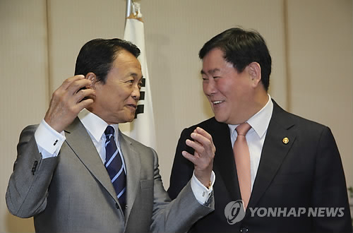 | △ 활짝 웃는 한·일 재무장관 (도쿄 AP=연합뉴스) 최경환 부총리 겸 기획재정부 장관(오른쪽)과 아소 다로 일본 부총리 겸 재무상이 23일(현지시간) 일본 도쿄 미타 공용회의소에서 제6차 한일 재무장관회의를 시작하기 전 활짝 웃으며 얘기를 나누고 있다. 한일 재무장관회의가 열리기는 2년6개월 만이다. 또 현 정부 출범 이후 부총리급 이상의 고위 각료가 일본을 방문한 것도 이번이 처음이다. |