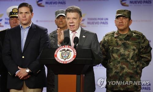 | △ 후안 마누엘 산토스 콜롬비아 대통령이 지난 21일(현지시간) 최대 반군인 콜롬비아무장혁명군(FARC)의 캠프를 공습한 뒤 성명을 발표하고 있다.(AP=연합뉴스DB) |
