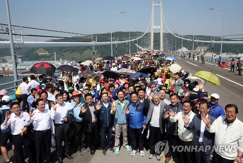 | △ 울산대교 시민개방의 날 (울산=연합뉴스) 김용태 기자 = 26일 오후 울산대교에서 열린 '준공 기념 시민개방의 날' 행사에 참가한 김기현 울산시장 등 내빈과 시민이 울산대교 위에서 손을 흔들고 있다. 이날 남구와 동구에서 각각 출발한 남·동구 주민들은 대교 가운데서 만나 악수를 하며 즐거움을 나눴다. 2015.5.26 yongtae@yna.co.kr |