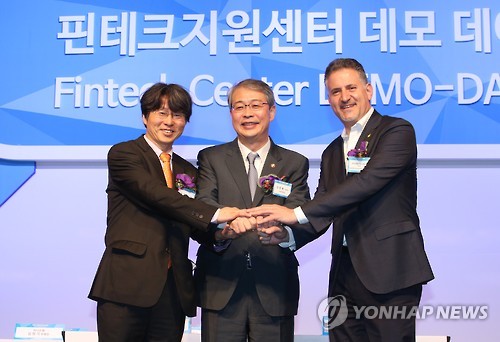 | △ 핀테크 육성 위한 MOU (서울=연합뉴스) 서명곤 기자 = 27일 오전 서울 종로구 그랑서울에서 열린 핀테크지원센터 2차 데모데이 행사에서 임종룡 금융위원장(가운데)이 한국 핀테크스타트업 육성을 위한 양해각서(MOU)를 체결한 정유신 핀테크지원센터장, 에렉 반데클레이 '레블(level)39' 대표와 기념촬영을 하고 있다. |