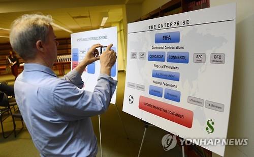 | △ 미국 법무부가 국제축구연맹(FIFA) 뇌물스캔들에 연루된 FIFA 전현직 간부와 주변인 등 14명에 대한 기소 방침을 밝힌 27일(현지시간) 한 기자가 검찰이 공개한 조직도 사진을 찍고 있다.(EPA=연합뉴스) |