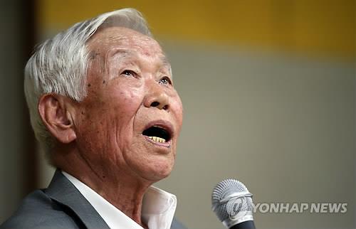 | △ 일제강점기 때 일본 후쿠오카의 아소 탄광에서 강제노역한 공재수 할아버지가 2015년 5월 9일 광주 서구 광주청소년문화센터에서 눈물을 흘리며 당시 경험을 말하고 있다. (연합뉴스 자료사진) |