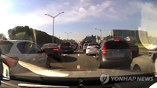 | △ 성남판 '모세의 기적'에 수면제 삼킨 아기 목숨 건져 (성남=연합뉴스) 27일 오전 8시 30분께 경기도 성남시 수정구 한 도로에서 수면제를 삼킨 9달된 아기를 태우고 달리는 순찰차를 보고, 운전자들이 길을 터주고 있다. 이 성남판 '모세의 기적'에 아기는 무사히 치료를 받았다.2015.5.28<<성남수정서 순찰차 블랙박스 캡처화면>> goals@yna.co.kr |