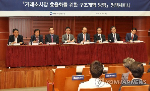 | △ '거래소시장 효율화를 위한 구조개혁 방향' 세미나 (서울=연합뉴스) 28일 오후 서울 여의도 금융투자협회에서 자본시장연구원이 주최한 '거래소시장 효율화를 위한 구조개혁 방향' 세미나가 진행되고 있다. 2015.05.28 << 자본시장연구원 제공 >> photo@yna.co.kr |