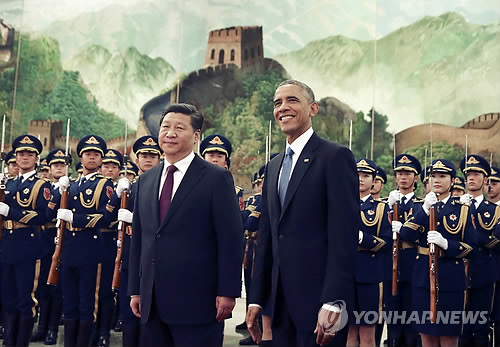 | △ 시진핑, 올 9월 첫 미국 국빈 방문 (AP=연합뉴스) 시진핑 중국 국가주석이 취임 후 처음으로 오는 9월 미국을 국빈 방문한다고 중국 관영 신화통신이 11일(현지시간) 보도했다. 사진은 지난해 11월 12일 버락 오바마 미국 대통령(오른쪽)이 중국을 방문, 베이징 인민대회당에서 열린 환영식에서 시 주석과 함께 포즈를 취하고 있는 모습. marshal@yna.co.kr FILE - In this Nov. 12, 2014 file photo, U.S. President Barack Obama, right smiles as a group of children wave flags and flowers during a welcome ceremony held by Chinese President Xi Jinping at the Great Hall of the People in Beijing, China. Xi will make his first state visit as president to the United States in September, Chinese official media reported Wednesday, Feb. 11, 2015, underlining positive momentum in the often-troubled relationship between the world’s largest economies. (AP Photo/Andy Wong, File) |