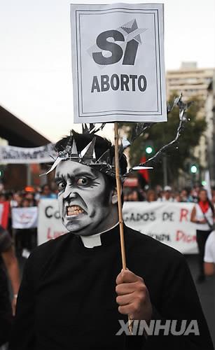 | △ 지난 3월 여성의 날 칠레 산티아고에서 열린 행진에서 한 참가자가 가톨릭 신부 복장에 낙태를 찬성 팻말을 들고 있다. (신화=연합뉴스) |