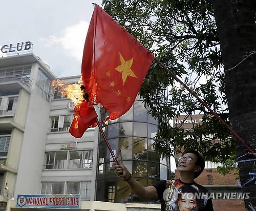 | △ (마닐라 AP=연합뉴스 자료사진) 남중국해의 스프래틀리 제도를 놓고 필리핀과 영유권 분쟁을 벌이고 있는 중국이 산호초 매립 작업을 계속하는데 항의해 필리핀에서 경찰서장과 시장을 지낸 아브네르 아푸앙 씨가 지난 23일 필리핀 수도 마닐라 대로변 가로수에 오성홍기를 묶어 놓고 불을 붙이고 있다. 중국은 스프래틀리 제도 내 존슨 산호초(중국명 츠과자오<赤瓜礁>, 필리핀명 마비니 산호초)에 활주로로 보이는 시설을 만드는 등 3개 산호초에서 매립작업을 벌였고, 필리핀 정부는 여러 차례 항의했다. |