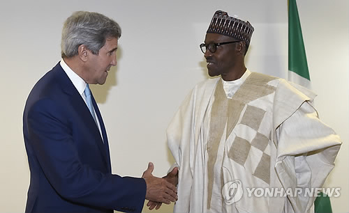 | △ "대통령 취임을 축하합니다" (아부자 AP=연합뉴스) 존 케리 미국 국무장관(왼쪽)이 29일(현지시간) 나이지리아 아부자에서 무함마두 부하리 신임 나이지리아 대통령의 취임을 축하하며 악수를 나누고 있다. marshal@yna.co.kr |
