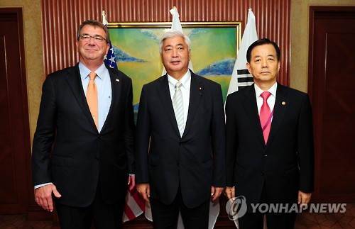 | △ 기념촬영하는 한-미-일 국방장관 (서울=연합뉴스) 싱가포르에서 열린 제14차 아시아안보회의(샹그릴라 대화)에 참석 중인 한민구 국방부 장관(오른쪽)이 30일 애슈턴 카터 미국 국방장관(왼쪽), 나카타니 겐(中谷元) 일본 방위상과 회담에 앞서 기념촬영을 하고 있다. 2015.5.30 << 국방부 제공 >> photo@yna.co.kr |