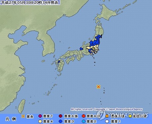 (도쿄=연합뉴스) 이세원 특파원 = 30일 오후 8시 24분께 일본 도쿄도(東京都) 남쪽 북태평양에 있는 오가사와라(小笠原)제도 인근에서 강한 규모 8.5(추정치)의 강한 지진이 발생했다.