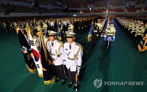 | △ '본격 출범' U대회 경찰 전담경비단 (광주=연합뉴스) 박철홍 기자 = 29일 오전 광주 광산구 광주여대 유니버시아드체육관에서 광주 U대회 경찰 전담경비단 발대식이 열려 경비단 소속 경찰관들이 도열해 있다. 2015.5.29 pch80@yna.co.kr |