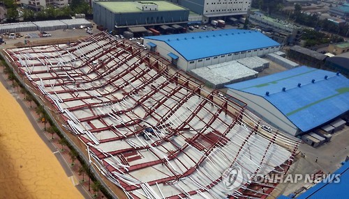 | △ 무너져 내린 인천조달청 신축 창고 (인천=연합뉴스) 손현규 기자 = 31일 오전 10시 48분께 인천시 중구 신흥동 인천지방조달청 옆 신축창고 공사장에서 철골 구조물이 일부 무너졌다. 이 사고로 작업 중이던 근로자 5명이 5m 아래로 떨어져 A(53)가 숨지고 나머지 4명은 인근 병원으로 옮겨져 치료를 받고 있다. 2015.5.31 son@yna.co.kr |