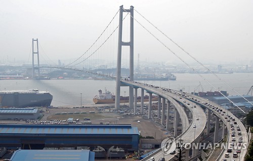| △ '개통' 울산대교 위 차량 행렬 (울산=연합뉴스) 김용태 기자 = 울산대교가 개통한 1일 오후 울산시 동구 염포산에서 바라본 울산대교의 모습. 차량이 대교 위를 줄지어 달리고 있다. 2015.6.1 yongtae@yna.co.kr |