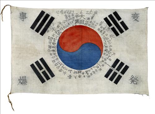 | △ '끝나지 않은 이야기전'에 전시된 이철희 사변 폭발 태극기. 이 태극기는 특무 상사 이철희가 6·25 전쟁 때 지니고 있었던 태극기다. |