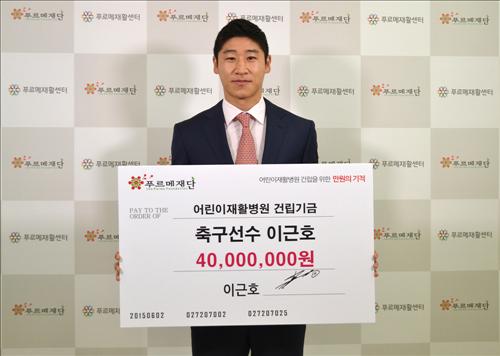 (서울=연합뉴스) 설승은 기자 = 푸르메재단은 축구선수 이근호(30·엘 자이시)선수가 어린이재활병원 건립에 써 달라며 4천만원을 기부했다고 2일 밝혔다.