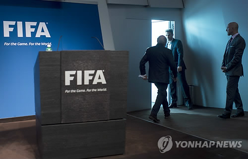 | △ 떠나는 블라터 (취리히 AP=연합뉴스) 제프 블라터 국제축구연맹(FIFA) 회장이 2일(현지시간) 스위스 취리히의 FIFA 본부에서 긴급 기자회견을 갖고 사의를 표명한 뒤 회견장을 떠나고 있다. 미국 연방수사국(FBI)과 연방검찰은 FIFA 부패 스캔들과 관련해 블라터 회장을 수사하고 있는 것으로 알려졌다. marshal@yna.co.kr |