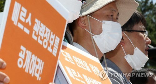 | △ 메르스 대책 촉구 기자회견 (수원=연합뉴스) 신영근 기자 = 3일 오전 경기도 수원 경기도청 앞에서 민주노총 경기도본부 주최로 '메르스 확산 방지 및 도민 안전을 위한 경기도의 특별 대책 촉구 기자회견' 이 열려 한 참가자가 메르스 관련 정보 공개를 요구하는 팻말을 들고 있다. 2015.6.3 drops@yna.co.kr http://blog.yonhapnews.co.kr/geenang |