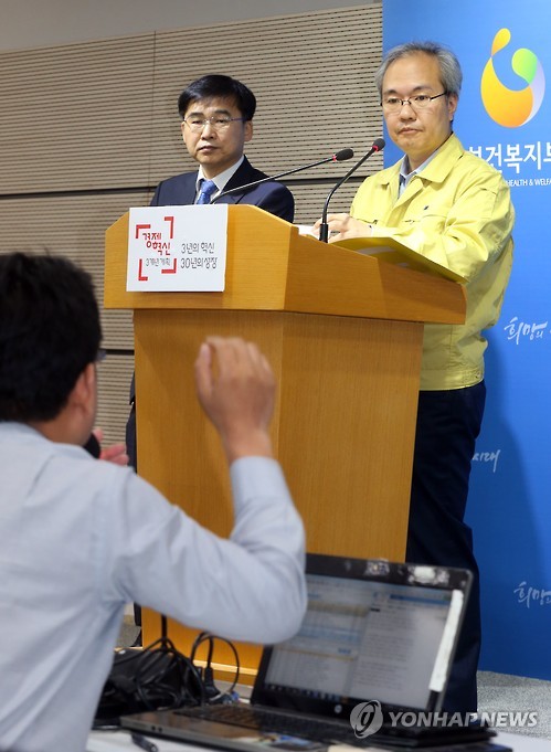 | △ 메르스 상황 브리핑 (세종=연합뉴스) 배재만 기자 = 중앙메르스관리대책본부 기획총괄반장인 권준욱 보건복지부 공공보건정책관이 3일 오전 정부세종청사 공용브리핑룸에서 열린 정례브리핑에서 취재진의 질문에 답하고 있다. 왼쪽은 김우주 대한감염학회 이사장. |