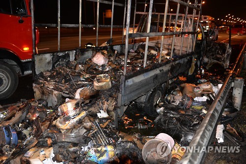 | △ 불타버린 트럭 (고양=연합뉴스) 지난 2일 오후 경기도 고양시 자유로를 달리던 트럭에서 불이 나 소방관들이 화재를 진화하고 있다. 2015.6.3 <<고양소방서>> suki@yna.co.kr |