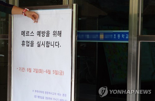 | △ 초등학교 휴업 (수원=연합뉴스) 류수현 기자 = 2일 경기도교육청 등에 따르면 전날 메르스 첫 번째 환자와 접촉한 S(58·여)씨가 숨진 병원 소재지 초등학교 한 곳이 이날부터 오는 5일까지 휴업한다. 메르스 발생 후 전국 첫 휴업사례다. 학교 관계자가 현관문 앞에 휴업 안내문을 설치하고 있다. 2015.6.2 you@yna.co.kr |