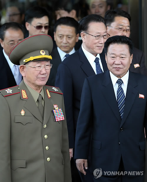 | △ 지난해 10월 인천 인천 아시안게임 폐막식에 참석한 황병서 총 정치국장(왼쪽), 김양건(가운데) 대남담당 비서.(연합뉴스 자료사진) |