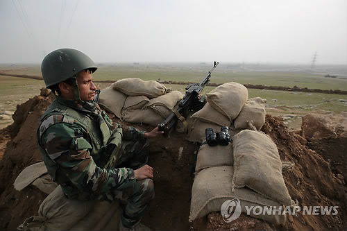 | △ 모술 노려보는 페쉬메르가 전사 (AP=연합뉴스) 이슬람국가(IS) 점령지역인 이라크 제2도시 모술시 부근에 전투력을 집중하고 있는 쿠르드자치정부 군사조직 페쉬메르가의 한 전사가 27일(현지시간) 이스키모술에 구축한 참호 속에서 모술로 이어지는 도로를 지켜보고 있다. marshal@yna.co.kr |