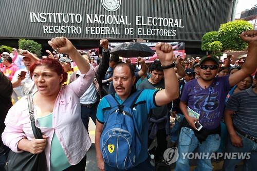 | △ 멕시코 교원노조 소속 교사들이 2일(현지시간) 수도 멕시코시티의 선거위원회 앞에서 시위를 벌이면서 7일 예정된 중간선거의 보이콧을 전개하겠다고 선언했다.(EPA=연합뉴스) |