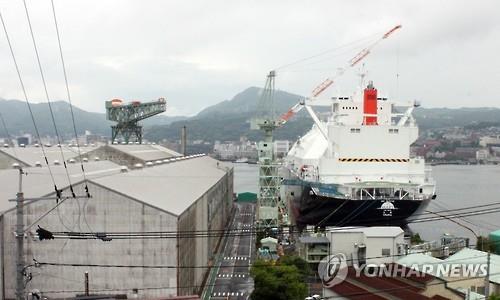 | △ 일본 나가사키(長崎)현 나가사키시에 있는 미쓰비시(三菱) 중공업의 나가사키 조선소 내에 설치된 크레인이 3일 오후 인근 언덕에서 내려다보인다. |