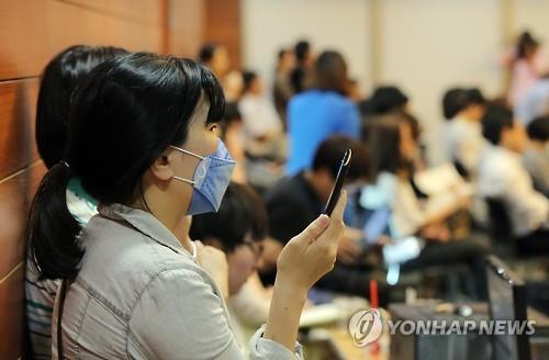 | △ 메르스, 바로 알고 극복하자' (서울=연합뉴스) 이정훈 기자 = 4일 오후 서울 중구 포스트타워에서 메르스 민·관합동대책반 주최로 열린 '메르스, 바로 알고 극복하자' 세미나에서 한 참석자가 마스크를 착용한 채 메르스의 역학적 특성에 대해 강의를 듣고 있다. |